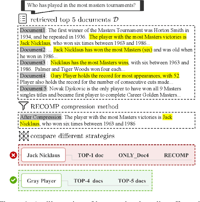 Abstract:Retrieved documents containing noise will hinder RAG from detecting answer clues and make the inference process slow and expensive. Therefore, context compression is necessary to enhance its accuracy and efficiency. Existing context compression methods use extractive or generative models to retain the most query-relevant sentences or apply the information bottleneck theory to preserve sufficient information. However, these methods may face issues such as over-compression or high computational costs. We observe that the retriever often ranks relevant documents at the top, but the exact number of documents needed to answer the query is uncertain due to the impact of query complexity and retrieval quality: complex queries like multi-hop questions may require retaining more documents than simpler queries, and a low-quality retrieval may need to rely on more documents to generate accurate outputs. Therefore, determining the minimum number of required documents (compression rate) is still a challenge for RAG. In this paper, we introduce AdaComp, a low-cost extractive context compression method that adaptively determines the compression rate based on both query complexity and retrieval quality. Specifically, we first annotate the minimum top-k documents necessary for the RAG system to answer the current query as the compression rate and then construct triplets of the query, retrieved documents, and its compression rate. Then, we use this triplet dataset to train a compression-rate predictor. Experiments on three QA datasets and one conversational Muiti-doc QA dataset show that AdaComp significantly reduces inference costs while maintaining performance nearly identical to uncompressed models, achieving a balance between efficiency and performance.