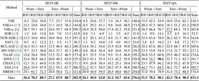 Abstract:In this paper, we present and study a new instance-level retrieval task: PointCloud-Text Matching~(PTM), which aims to find the exact cross-modal instance that matches a given point-cloud query or text query. PTM could be applied to various scenarios, such as indoor/urban-canyon localization and scene retrieval. However, there exists no suitable and targeted dataset for PTM in practice. Therefore, we construct three new PTM benchmark datasets, namely 3D2T-SR, 3D2T-NR, and 3D2T-QA. We observe that the data is challenging and with noisy correspondence due to the sparsity, noise, or disorder of point clouds and the ambiguity, vagueness, or incompleteness of texts, which make existing cross-modal matching methods ineffective for PTM. To tackle these challenges, we propose a PTM baseline, named Robust PointCloud-Text Matching method (RoMa). RoMa consists of two modules: a Dual Attention Perception module (DAP) and a Robust Negative Contrastive Learning module (RNCL). Specifically, DAP leverages token-level and feature-level attention to adaptively focus on useful local and global features, and aggregate them into common representations, thereby reducing the adverse impact of noise and ambiguity. To handle noisy correspondence, RNCL divides negative pairs, which are much less error-prone than positive pairs, into clean and noisy subsets, and assigns them forward and reverse optimization directions respectively, thus enhancing robustness against noisy correspondence. We conduct extensive experiments on our benchmarks and demonstrate the superiority of our RoMa.