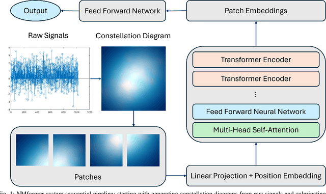 Abstract:Modulation classification is a very challenging task since the signals intertwine with various ambient noises. Methods are required that can classify them without adding extra steps like denoising, which introduces computational complexity. In this study, we propose a vision transformer (ViT) based model named NMformer to predict the channel modulation images with different noise levels in wireless communication. Since ViTs are most effective for RGB images, we generated constellation diagrams from the modulated signals. The diagrams provide the information from the signals in a 2-D representation form. We trained NMformer on 106, 800 modulation images to build the base classifier and only used 3, 000 images to fine-tune for specific tasks. Our proposed model has two different kinds of prediction setups: in-distribution and out-of-distribution. Our model achieves 4.67% higher accuracy than the base classifier when finetuned and tested on high signal-to-noise ratios (SNRs) in-distribution classes. Moreover, the fine-tuned low SNR task achieves a higher accuracy than the base classifier. The fine-tuned classifier becomes much more effective than the base classifier by achieving higher accuracy when predicted, even on unseen data from out-of-distribution classes. Extensive experiments show the effectiveness of NMformer for a wide range of SNRs.