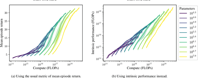 Abstract:Recent work has shown that, in generative modeling, cross-entropy loss improves smoothly with model size and training compute, following a power law plus constant scaling law. One challenge in extending these results to reinforcement learning is that the main performance objective of interest, mean episode return, need not vary smoothly. To overcome this, we introduce *intrinsic performance*, a monotonic function of the return defined as the minimum compute required to achieve the given return across a family of models of different sizes. We find that, across a range of environments, intrinsic performance scales as a power law in model size and environment interactions. Consequently, as in generative modeling, the optimal model size scales as a power law in the training compute budget. Furthermore, we study how this relationship varies with the environment and with other properties of the training setup. In particular, using a toy MNIST-based environment, we show that varying the "horizon length" of the task mostly changes the coefficient but not the exponent of this relationship.