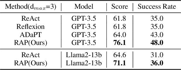 Abstract:Owing to recent advancements, Large Language Models (LLMs) can now be deployed as agents for increasingly complex decision-making applications in areas including robotics, gaming, and API integration. However, reflecting past experiences in current decision-making processes, an innate human behavior, continues to pose significant challenges. Addressing this, we propose Retrieval-Augmented Planning (RAP) framework, designed to dynamically leverage past experiences corresponding to the current situation and context, thereby enhancing agents' planning capabilities. RAP distinguishes itself by being versatile: it excels in both text-only and multimodal environments, making it suitable for a wide range of tasks. Empirical evaluations demonstrate RAP's effectiveness, where it achieves SOTA performance in textual scenarios and notably enhances multimodal LLM agents' performance for embodied tasks. These results highlight RAP's potential in advancing the functionality and applicability of LLM agents in complex, real-world applications.