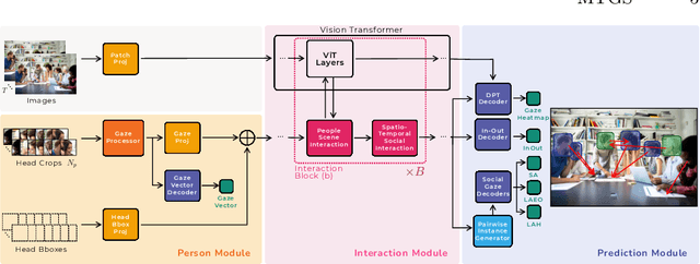 Abstract:Gaze following and social gaze prediction are fundamental tasks providing insights into human communication behaviors, intent, and social interactions. Most previous approaches addressed these tasks separately, either by designing highly specialized social gaze models that do not generalize to other social gaze tasks or by considering social gaze inference as an ad-hoc post-processing of the gaze following task. Furthermore, the vast majority of gaze following approaches have proposed static models that can handle only one person at a time, therefore failing to take advantage of social interactions and temporal dynamics. In this paper, we address these limitations and introduce a novel framework to jointly predict the gaze target and social gaze label for all people in the scene. The framework comprises of: (i) a temporal, transformer-based architecture that, in addition to image tokens, handles person-specific tokens capturing the gaze information related to each individual; (ii) a new dataset, VSGaze, that unifies annotation types across multiple gaze following and social gaze datasets. We show that our model trained on VSGaze can address all tasks jointly, and achieves state-of-the-art results for multi-person gaze following and social gaze prediction.