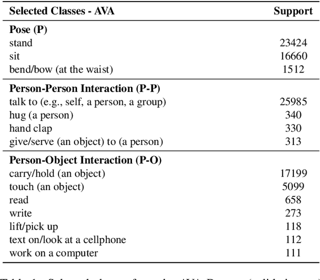 Abstract:Hand-Object Interaction (HOI) is gaining significant attention, particularly with the creation of numerous egocentric datasets driven by AR/VR applications. However, third-person view HOI has received less attention, especially in terms of datasets. Most third-person view datasets are curated for action recognition tasks and feature pre-segmented clips of high-level daily activities, leaving a gap for in-the-wild datasets. To address this gap, we propose ChildPlay-Hand, a novel dataset that includes person and object bounding boxes, as well as manipulation actions. ChildPlay-Hand is unique in: (1) providing per-hand annotations; (2) featuring videos in uncontrolled settings with natural interactions, involving both adults and children; (3) including gaze labels from the ChildPlay-Gaze dataset for joint modeling of manipulations and gaze. The manipulation actions cover the main stages of an HOI cycle, such as grasping, holding or operating, and different types of releasing. To illustrate the interest of the dataset, we study two tasks: object in hand detection (OiH), i.e. if a person has an object in their hand, and manipulation stages (ManiS), which is more fine-grained and targets the main stages of manipulation. We benchmark various spatio-temporal and segmentation networks, exploring body vs. hand-region information and comparing pose and RGB modalities. Our findings suggest that ChildPlay-Hand is a challenging new benchmark for modeling HOI in the wild.