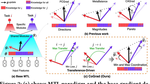 Abstract:Multi-task learning (MTL) has been widely applied in online advertising and recommender systems. To address the negative transfer issue, recent studies have proposed optimization methods that thoroughly focus on the gradient alignment of directions or magnitudes. However, since prior study has proven that both general and specific knowledge exist in the limited shared capacity, overemphasizing on gradient alignment may crowd out task-specific knowledge, and vice versa. In this paper, we propose a transference-driven approach CoGrad that adaptively maximizes knowledge transference via Coordinated Gradient modification. We explicitly quantify the transference as loss reduction from one task to another, and then derive an auxiliary gradient from optimizing it. We perform the optimization by incorporating this gradient into original task gradients, making the model automatically maximize inter-task transfer and minimize individual losses. Thus, CoGrad can harmonize between general and specific knowledge to boost overall performance. Besides, we introduce an efficient approximation of the Hessian matrix, making CoGrad computationally efficient and simple to implement. Both offline and online experiments verify that CoGrad significantly outperforms previous methods.