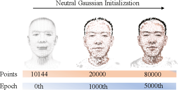 Abstract:We propose GGAvatar, a novel 3D avatar representation designed to robustly model dynamic head avatars with complex identities and deformations. GGAvatar employs a coarse-to-fine structure, featuring two core modules: Neutral Gaussian Initialization Module and Geometry Morph Adjuster. Neutral Gaussian Initialization Module pairs Gaussian primitives with deformable triangular meshes, employing an adaptive density control strategy to model the geometric structure of the target subject with neutral expressions. Geometry Morph Adjuster introduces deformation bases for each Gaussian in global space, creating fine-grained low-dimensional representations of deformation behaviors to address the Linear Blend Skinning formula's limitations effectively. Extensive experiments show that GGAvatar can produce high-fidelity renderings, outperforming state-of-the-art methods in visual quality and quantitative metrics.