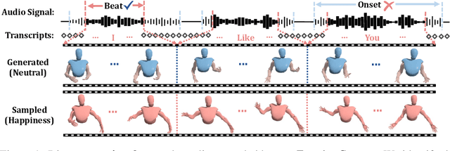 Abstract:Generating vivid and diverse 3D co-speech gestures is crucial for various applications in animating virtual avatars. While most existing methods can generate gestures from audio directly, they usually overlook that emotion is one of the key factors of authentic co-speech gesture generation. In this work, we propose EmotionGesture, a novel framework for synthesizing vivid and diverse emotional co-speech 3D gestures from audio. Considering emotion is often entangled with the rhythmic beat in speech audio, we first develop an Emotion-Beat Mining module (EBM) to extract the emotion and audio beat features as well as model their correlation via a transcript-based visual-rhythm alignment. Then, we propose an initial pose based Spatial-Temporal Prompter (STP) to generate future gestures from the given initial poses. STP effectively models the spatial-temporal correlations between the initial poses and the future gestures, thus producing the spatial-temporal coherent pose prompt. Once we obtain pose prompts, emotion, and audio beat features, we will generate 3D co-speech gestures through a transformer architecture. However, considering the poses of existing datasets often contain jittering effects, this would lead to generating unstable gestures. To address this issue, we propose an effective objective function, dubbed Motion-Smooth Loss. Specifically, we model motion offset to compensate for jittering ground-truth by forcing gestures to be smooth. Last, we present an emotion-conditioned VAE to sample emotion features, enabling us to generate diverse emotional results. Extensive experiments demonstrate that our framework outperforms the state-of-the-art, achieving vivid and diverse emotional co-speech 3D gestures.
