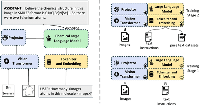 Abstract:In this technical report, we propose ChemVLM, the first open-source multimodal large language model dedicated to the fields of chemistry, designed to address the incompatibility between chemical image understanding and text analysis. Built upon the VIT-MLP-LLM architecture, we leverage ChemLLM-20B as the foundational large model, endowing our model with robust capabilities in understanding and utilizing chemical text knowledge. Additionally, we employ InternVIT-6B as a powerful image encoder. We have curated high-quality data from the chemical domain, including molecules, reaction formulas, and chemistry examination data, and compiled these into a bilingual multimodal question-answering dataset. We test the performance of our model on multiple open-source benchmarks and three custom evaluation sets. Experimental results demonstrate that our model achieves excellent performance, securing state-of-the-art results in five out of six involved tasks. Our model can be found at https://huggingface.co/AI4Chem/ChemVLM-26B.