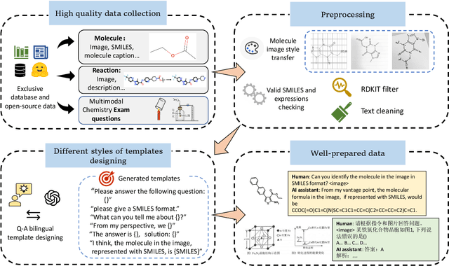 Abstract:Large Language Models (LLMs) have achieved remarkable success and have been applied across various scientific fields, including chemistry. However, many chemical tasks require the processing of visual information, which cannot be successfully handled by existing chemical LLMs. This brings a growing need for models capable of integrating multimodal information in the chemical domain. In this paper, we introduce \textbf{ChemVLM}, an open-source chemical multimodal large language model specifically designed for chemical applications. ChemVLM is trained on a carefully curated bilingual multimodal dataset that enhances its ability to understand both textual and visual chemical information, including molecular structures, reactions, and chemistry examination questions. We develop three datasets for comprehensive evaluation, tailored to Chemical Optical Character Recognition (OCR), Multimodal Chemical Reasoning (MMCR), and Multimodal Molecule Understanding tasks. We benchmark ChemVLM against a range of open-source and proprietary multimodal large language models on various tasks. Experimental results demonstrate that ChemVLM achieves competitive performance across all evaluated tasks. Our model can be found at https://huggingface.co/AI4Chem/ChemVLM-26B.