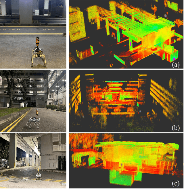 Abstract:Conventional single LiDAR systems are inherently constrained by their limited field of view (FoV), leading to blind spots and incomplete environmental awareness, particularly on robotic platforms with strict payload limitations. Integrating a motorized LiDAR offers a practical solution by significantly expanding the sensor's FoV and enabling adaptive panoramic 3D sensing. However, the high-frequency vibrations of the quadruped robot introduce calibration challenges, causing variations in the LiDAR-motor transformation that degrade sensing accuracy. Existing calibration methods that use artificial targets or dense feature extraction lack feasibility for on-site applications and real-time implementation. To overcome these limitations, we propose LiMo-Calib, an efficient on-site calibration method that eliminates the need for external targets by leveraging geometric features directly from raw LiDAR scans. LiMo-Calib optimizes feature selection based on normal distribution to accelerate convergence while maintaining accuracy and incorporates a reweighting mechanism that evaluates local plane fitting quality to enhance robustness. We integrate and validate the proposed method on a motorized LiDAR system mounted on a quadruped robot, demonstrating significant improvements in calibration efficiency and 3D sensing accuracy, making LiMo-Calib well-suited for real-world robotic applications. The demo video is available at: https://youtu.be/FMINa-sap7g
