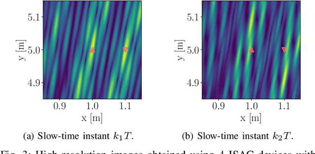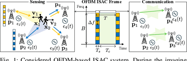 Abstract:Distributed integrated sensing and communication (ISAC) devices can overcome the traditional resolution limitations imposed by the signal bandwidth, cooperating to produce high-resolution images of the environment. However, existing phase-coherent imaging approaches are not suited to imaging multiple moving targets, since the Doppler effect causes a phase rotation that degrades the image focus and biases the targets' locations. In this paper, we propose MovISAC, the first coherent imaging method for moving targets using distributed asynchronous ISAC devices. Our approach obtains a set of high-resolution images of the environment, in which each image represents only targets moving with a selected velocity. To achieve this, MovISAC performs over-the-air (OTA) synchronization to compensate for timing, frequency, and phase offsets among distributed ISAC devices. Then, to solve the prohibitive complexity of an exhaustive search over the targets' velocities, we introduce a new association algorithm to match the Doppler shifts observed by each ISAC device pair to the corresponding spatial peaks obtained by standard imaging methods. This gives MovISAC the unique capability of pre-compensating the Doppler shift for each target before forming the images, thus recasting it from an undesired impairment to image formation to an additional means for resolving the targets. We perform extensive numerical simulations showing that our approach achieves extremely high resolution, superior robustness to clutter thanks to the additional target separation in the Doppler domain, and obtains cm- and cm/s-level target localization and velocity estimation errors. MovISAC significantly outperforms existing imaging methods that do not compensate for the Doppler shift, demonstrating up to 18 times lower localization error and enabling velocity estimation.