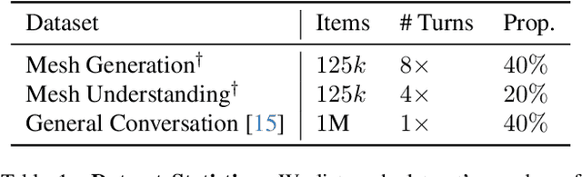 Abstract:This work explores expanding the capabilities of large language models (LLMs) pretrained on text to generate 3D meshes within a unified model. This offers key advantages of (1) leveraging spatial knowledge already embedded in LLMs, derived from textual sources like 3D tutorials, and (2) enabling conversational 3D generation and mesh understanding. A primary challenge is effectively tokenizing 3D mesh data into discrete tokens that LLMs can process seamlessly. To address this, we introduce LLaMA-Mesh, a novel approach that represents the vertex coordinates and face definitions of 3D meshes as plain text, allowing direct integration with LLMs without expanding the vocabulary. We construct a supervised fine-tuning (SFT) dataset enabling pretrained LLMs to (1) generate 3D meshes from text prompts, (2) produce interleaved text and 3D mesh outputs as required, and (3) understand and interpret 3D meshes. Our work is the first to demonstrate that LLMs can be fine-tuned to acquire complex spatial knowledge for 3D mesh generation in a text-based format, effectively unifying the 3D and text modalities. LLaMA-Mesh achieves mesh generation quality on par with models trained from scratch while maintaining strong text generation performance.