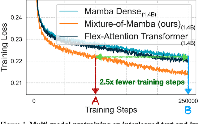 Abstract:State Space Models (SSMs) have emerged as efficient alternatives to Transformers for sequential modeling, but their inability to leverage modality-specific features limits their performance in multi-modal pretraining. Here, we propose Mixture-of-Mamba, a novel SSM architecture that introduces modality-aware sparsity through modality-specific parameterization of the Mamba block. Building on Mixture-of-Transformers (W. Liang et al. arXiv:2411.04996; 2024), we extend the benefits of modality-aware sparsity to SSMs while preserving their computational efficiency. We evaluate Mixture-of-Mamba across three multi-modal pretraining settings: Transfusion (interleaved text and continuous image tokens with diffusion loss), Chameleon (interleaved text and discrete image tokens), and an extended three-modality framework incorporating speech. Mixture-of-Mamba consistently reaches the same loss values at earlier training steps with significantly reduced computational costs. In the Transfusion setting, Mixture-of-Mamba achieves equivalent image loss using only 34.76% of the training FLOPs at the 1.4B scale. In the Chameleon setting, Mixture-of-Mamba reaches similar image loss with just 42.50% of the FLOPs at the 1.4B scale, and similar text loss with just 65.40% of the FLOPs. In the three-modality setting, MoM matches speech loss at 24.80% of the FLOPs at the 1.4B scale. Our ablation study highlights the synergistic effects of decoupling projection components, where joint decoupling yields greater gains than individual modifications. These results establish modality-aware sparsity as a versatile and effective design principle, extending its impact from Transformers to SSMs and setting new benchmarks in multi-modal pretraining. Our code can be accessed at https://github.com/Weixin-Liang/Mixture-of-Mamba