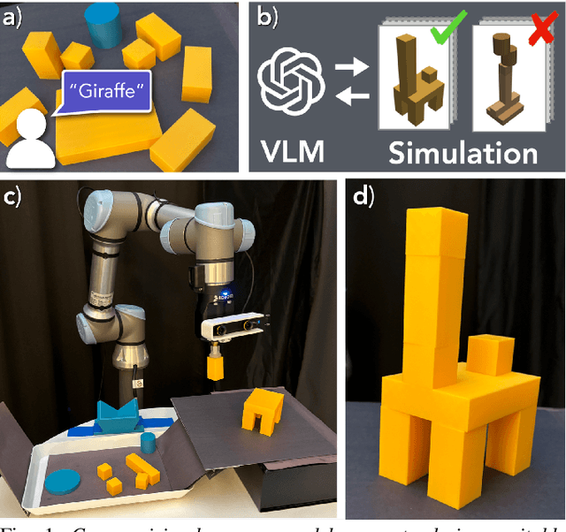 Abstract:Generative AI systems have shown impressive capabilities in creating text, code, and images. Inspired by the rich history of research in industrial ''Design for Assembly'', we introduce a novel problem: Generative Design-for-Robot-Assembly (GDfRA). The task is to generate an assembly based on a natural language prompt (e.g., ''giraffe'') and an image of available physical components, such as 3D-printed blocks. The output is an assembly, a spatial arrangement of these components, and instructions for a robot to build this assembly. The output must 1) resemble the requested object and 2) be reliably assembled by a 6 DoF robot arm with a suction gripper. We then present Blox-Net, a GDfRA system that combines generative vision language models with well-established methods in computer vision, simulation, perturbation analysis, motion planning, and physical robot experimentation to solve a class of GDfRA problems with minimal human supervision. Blox-Net achieved a Top-1 accuracy of 63.5% in the ''recognizability'' of its designed assemblies (eg, resembling giraffe as judged by a VLM). These designs, after automated perturbation redesign, were reliably assembled by a robot, achieving near-perfect success across 10 consecutive assembly iterations with human intervention only during reset prior to assembly. Surprisingly, this entire design process from textual word (''giraffe'') to reliable physical assembly is performed with zero human intervention.
