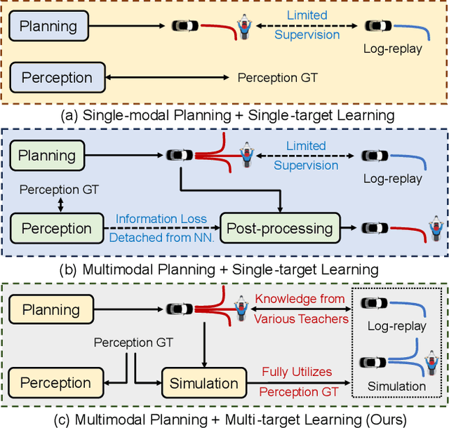 Abstract:We propose Hydra-MDP, a novel paradigm employing multiple teachers in a teacher-student model. This approach uses knowledge distillation from both human and rule-based teachers to train the student model, which features a multi-head decoder to learn diverse trajectory candidates tailored to various evaluation metrics. With the knowledge of rule-based teachers, Hydra-MDP learns how the environment influences the planning in an end-to-end manner instead of resorting to non-differentiable post-processing. This method achieves the $1^{st}$ place in the Navsim challenge, demonstrating significant improvements in generalization across diverse driving environments and conditions. Code will be available at \url{https://github.com/woxihuanjiangguo/Hydra-MDP}
