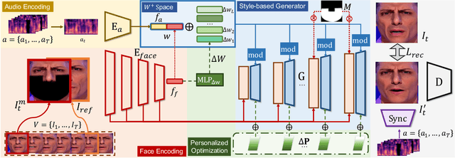 Abstract:Despite recent advances in syncing lip movements with any audio waves, current methods still struggle to balance generation quality and the model's generalization ability. Previous studies either require long-term data for training or produce a similar movement pattern on all subjects with low quality. In this paper, we propose StyleSync, an effective framework that enables high-fidelity lip synchronization. We identify that a style-based generator would sufficiently enable such a charming property on both one-shot and few-shot scenarios. Specifically, we design a mask-guided spatial information encoding module that preserves the details of the given face. The mouth shapes are accurately modified by audio through modulated convolutions. Moreover, our design also enables personalized lip-sync by introducing style space and generator refinement on only limited frames. Thus the identity and talking style of a target person could be accurately preserved. Extensive experiments demonstrate the effectiveness of our method in producing high-fidelity results on a variety of scenes. Resources can be found at https://hangz-nju-cuhk.github.io/projects/StyleSync.