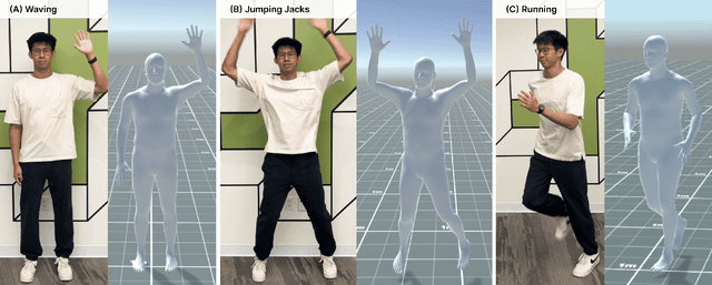 Abstract:There has been a continued trend towards minimizing instrumentation for full-body motion capture, going from specialized rooms and equipment, to arrays of worn sensors and recently sparse inertial pose capture methods. However, as these techniques migrate towards lower-fidelity IMUs on ubiquitous commodity devices, like phones, watches, and earbuds, challenges arise including compromised online performance, temporal consistency, and loss of global translation due to sensor noise and drift. Addressing these challenges, we introduce MobilePoser, a real-time system for full-body pose and global translation estimation using any available subset of IMUs already present in these consumer devices. MobilePoser employs a multi-stage deep neural network for kinematic pose estimation followed by a physics-based motion optimizer, achieving state-of-the-art accuracy while remaining lightweight. We conclude with a series of demonstrative applications to illustrate the unique potential of MobilePoser across a variety of fields, such as health and wellness, gaming, and indoor navigation to name a few.