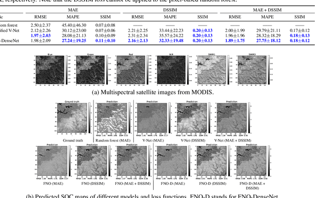 Abstract:Soil organic carbon (SOC) sequestration is the transfer and storage of atmospheric carbon dioxide in soils, which plays an important role in climate change mitigation. SOC concentration can be improved by proper land use, thus it is beneficial if SOC can be estimated at a regional or global scale. As multispectral satellite data can provide SOC-related information such as vegetation and soil properties at a global scale, estimation of SOC through satellite data has been explored as an alternative to manual soil sampling. Although existing studies show promising results, they are mainly based on pixel-based approaches with traditional machine learning methods, and convolutional neural networks (CNNs) are uncommon. To study the use of CNNs on SOC remote sensing, here we propose the FNO-DenseNet based on the Fourier neural operator (FNO). By combining the advantages of the FNO and DenseNet, the FNO-DenseNet outperformed the FNO in our experiments with hundreds of times fewer parameters. The FNO-DenseNet also outperformed a pixel-based random forest by 18% in the mean absolute percentage error.