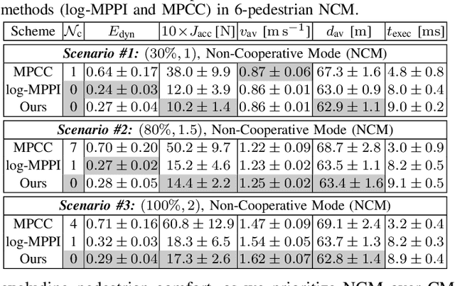 Abstract:Navigating safely in dynamic and uncertain environments is challenging due to uncertainties in perception and motion. This letter presents C2U-MPPI, a robust sampling-based Model Predictive Control (MPC) framework that addresses these challenges by leveraging the Unscented Model Predictive Path Integral (U-MPPI) control strategy with integrated probabilistic chance constraints, ensuring more reliable and efficient navigation under uncertainty. Unlike gradient-based MPC methods, our approach (i) avoids linearization of system dynamics and directly applies non-convex and nonlinear chance constraints, enabling more accurate and flexible optimization, and (ii) enhances computational efficiency by reformulating probabilistic constraints into a deterministic form and employing a layered dynamic obstacle representation, enabling real-time handling of multiple obstacles. Extensive experiments in simulated and real-world human-shared environments validate the effectiveness of our algorithm against baseline methods, showcasing its capability to generate feasible trajectories and control inputs that adhere to system dynamics and constraints in dynamic settings, enabled by unscented-based sampling strategy and risk-sensitive trajectory evaluation. A supplementary video is available at: https://youtu.be/FptAhvJlQm8