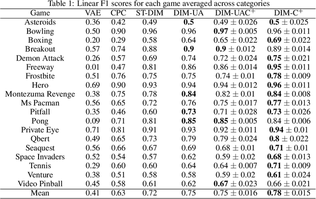 Abstract:The manifold hypothesis posits that high-dimensional data often lies on a lower-dimensional manifold and that utilizing this manifold as the target space yields more efficient representations. While numerous traditional manifold-based techniques exist for dimensionality reduction, their application in self-supervised learning has witnessed slow progress. The recent MSIMCLR method combines manifold encoding with SimCLR but requires extremely low target encoding dimensions to outperform SimCLR, limiting its applicability. This paper introduces a novel learning paradigm using an unbalanced atlas (UA), capable of surpassing state-of-the-art self-supervised learning approaches. We meticulously investigated and engineered the DeepInfomax with an unbalanced atlas (DIM-UA) method by systematically adapting the Spatiotemporal DeepInfomax (ST-DIM) framework to align with our proposed UA paradigm, employing rigorous scientific methodologies throughout the process. The efficacy of DIM-UA is demonstrated through training and evaluation on the Atari Annotated RAM Interface (AtariARI) benchmark, a modified version of the Atari 2600 framework that produces annotated image samples for representation learning. The UA paradigm improves the existing algorithm significantly when the number of target encoding dimensions grows. For instance, the mean F1 score averaged over categories of DIM-UA is ~75% compared to ~70% of ST-DIM when using 16384 hidden units.