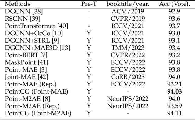 Abstract:The core of self-supervised point cloud learning lies in setting up appropriate pretext tasks, to construct a pre-training framework that enables the encoder to perceive 3D objects effectively. In this paper, we integrate two prevalent methods, masked point modeling (MPM) and 3D-to-2D generation, as pretext tasks within a pre-training framework. We leverage the spatial awareness and precise supervision offered by these two methods to address their respective limitations: ambiguous supervision signals and insensitivity to geometric information. Specifically, the proposed framework, abbreviated as PointCG, consists of a Hidden Point Completion (HPC) module and an Arbitrary-view Image Generation (AIG) module. We first capture visible points from arbitrary views as inputs by removing hidden points. Then, HPC extracts representations of the inputs with an encoder and completes the entire shape with a decoder, while AIG is used to generate rendered images based on the visible points' representations. Extensive experiments demonstrate the superiority of the proposed method over the baselines in various downstream tasks. Our code will be made available upon acceptance.