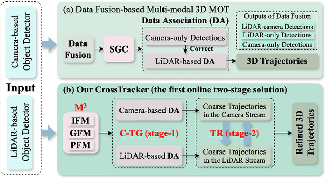 Abstract:The fusion of camera- and LiDAR-based detections offers a promising solution to mitigate tracking failures in 3D multi-object tracking (MOT). However, existing methods predominantly exploit camera detections to correct tracking failures caused by potential LiDAR detection problems, neglecting the reciprocal benefit of refining camera detections using LiDAR data. This limitation is rooted in their single-stage architecture, akin to single-stage object detectors, lacking a dedicated trajectory refinement module to fully exploit the complementary multi-modal information. To this end, we introduce CrossTracker, a novel two-stage paradigm for online multi-modal 3D MOT. CrossTracker operates in a coarse-to-fine manner, initially generating coarse trajectories and subsequently refining them through an independent refinement process. Specifically, CrossTracker incorporates three essential modules: i) a multi-modal modeling (M^3) module that, by fusing multi-modal information (images, point clouds, and even plane geometry extracted from images), provides a robust metric for subsequent trajectory generation. ii) a coarse trajectory generation (C-TG) module that generates initial coarse dual-stream trajectories, and iii) a trajectory refinement (TR) module that refines coarse trajectories through cross correction between camera and LiDAR streams. Comprehensive experiments demonstrate the superior performance of our CrossTracker over its eighteen competitors, underscoring its effectiveness in harnessing the synergistic benefits of camera and LiDAR sensors for robust multi-modal 3D MOT.