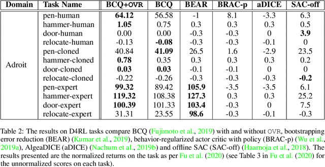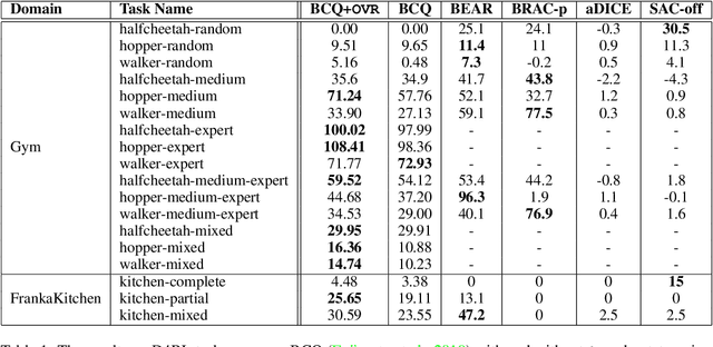Abstract:Learning policies from fixed offline datasets is a key challenge to scale up reinforcement learning (RL) algorithms towards practical applications. This is often because off-policy RL algorithms suffer from distributional shift, due to mismatch between dataset and the target policy, leading to high variance and over-estimation of value functions. In this work, we propose variance regularization for offline RL algorithms, using stationary distribution corrections. We show that by using Fenchel duality, we can avoid double sampling issues for computing the gradient of the variance regularizer. The proposed algorithm for offline variance regularization (OVAR) can be used to augment any existing offline policy optimization algorithms. We show that the regularizer leads to a lower bound to the offline policy optimization objective, which can help avoid over-estimation errors, and explains the benefits of our approach across a range of continuous control domains when compared to existing state-of-the-art algorithms.
