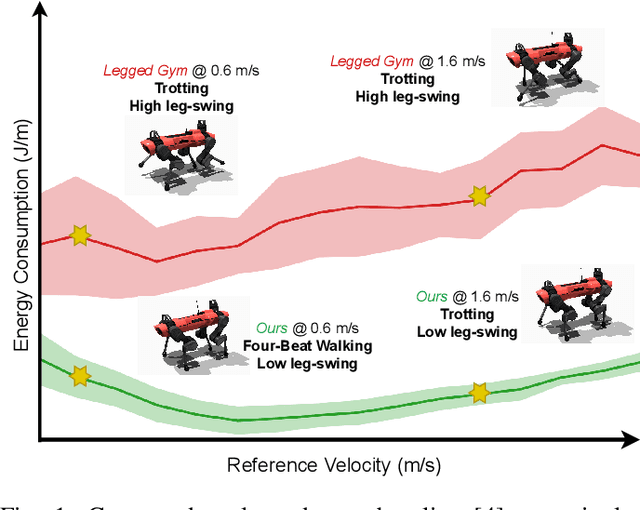 Abstract:In reinforcement learning for legged robot locomotion, crafting effective reward strategies is crucial. Pre-defined gait patterns and complex reward systems are widely used to stabilize policy training. Drawing from the natural locomotion behaviors of humans and animals, which adapt their gaits to minimize energy consumption, we propose a simplified, energy-centric reward strategy to foster the development of energy-efficient locomotion across various speeds in quadruped robots. By implementing an adaptive energy reward function and adjusting the weights based on velocity, we demonstrate that our approach enables ANYmal-C and Unitree Go1 robots to autonomously select appropriate gaits, such as four-beat walking at lower speeds and trotting at higher speeds, resulting in improved energy efficiency and stable velocity tracking compared to previous methods using complex reward designs and prior gait knowledge. The effectiveness of our policy is validated through simulations in the IsaacGym simulation environment and on real robots, demonstrating its potential to facilitate stable and adaptive locomotion.