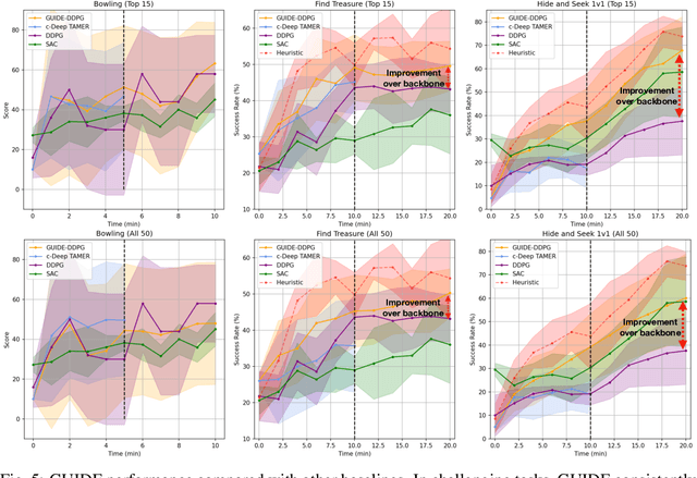 Abstract:The recent rapid advancement of machine learning has been driven by increasingly powerful models with the growing availability of training data and computational resources. However, real-time decision-making tasks with limited time and sparse learning signals remain challenging. One way of improving the learning speed and performance of these agents is to leverage human guidance. In this work, we introduce GUIDE, a framework for real-time human-guided reinforcement learning by enabling continuous human feedback and grounding such feedback into dense rewards to accelerate policy learning. Additionally, our method features a simulated feedback module that learns and replicates human feedback patterns in an online fashion, effectively reducing the need for human input while allowing continual training. We demonstrate the performance of our framework on challenging tasks with sparse rewards and visual observations. Our human study involving 50 subjects offers strong quantitative and qualitative evidence of the effectiveness of our approach. With only 10 minutes of human feedback, our algorithm achieves up to 30% increase in success rate compared to its RL baseline.