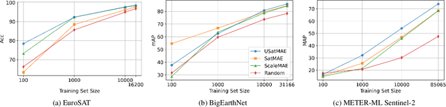 Abstract:Large, self-supervised vision models have led to substantial advancements for automatically interpreting natural images. Recent works have begun tailoring these methods to remote sensing data which has rich structure with multi-sensor, multi-spectral, and temporal information providing massive amounts of self-labeled data that can be used for self-supervised pre-training. In this work, we develop a new encoder architecture called USat that can input multi-spectral data from multiple sensors for self-supervised pre-training. USat is a vision transformer with modified patch projection layers and positional encodings to model spectral bands with varying spatial scales from multiple sensors. We integrate USat into a Masked Autoencoder (MAE) self-supervised pre-training procedure and find that a pre-trained USat outperforms state-of-the-art self-supervised MAE models trained on remote sensing data on multiple remote sensing benchmark datasets (up to 8%) and leads to improvements in low data regimes (up to 7%). Code and pre-trained weights are available at https://github.com/stanfordmlgroup/USat .