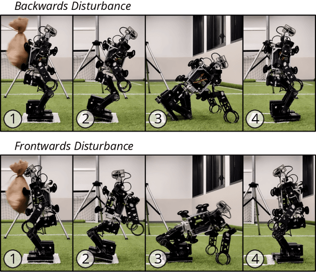 Abstract:Humanoid robotics faces significant challenges in achieving stable locomotion and recovering from falls in dynamic environments. Traditional methods, such as Model Predictive Control (MPC) and Key Frame Based (KFB) routines, either require extensive fine-tuning or lack real-time adaptability. This paper introduces FRASA, a Deep Reinforcement Learning (DRL) agent that integrates fall recovery and stand up strategies into a unified framework. Leveraging the Cross-Q algorithm, FRASA significantly reduces training time and offers a versatile recovery strategy that adapts to unpredictable disturbances. Comparative tests on Sigmaban humanoid robots demonstrate FRASA superior performance against the KFB method deployed in the RoboCup 2023 by the Rhoban Team, world champion of the KidSize League.