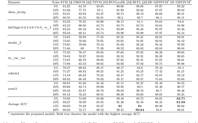 Abstract:In this paper, we propose enhanced feature based granular ball twin support vector machine (EF-GBTSVM). EF-GBTSVM employs the coarse granularity of granular balls (GBs) as input rather than individual data samples. The GBs are mapped to the feature space of the hidden layer using random projection followed by the utilization of a non-linear activation function. The concatenation of original and hidden features derived from the centers of GBs gives rise to an enhanced feature space, commonly referred to as the random vector functional link (RVFL) space. This space encapsulates nuanced feature information to GBs. Further, we employ twin support vector machine (TSVM) in the RVFL space for classification. TSVM generates the two non-parallel hyperplanes in the enhanced feature space, which improves the generalization performance of the proposed EF-GBTSVM model. Moreover, the coarser granularity of the GBs enables the proposed EF-GBTSVM model to exhibit robustness to resampling, showcasing reduced susceptibility to the impact of noise and outliers. We undertake a thorough evaluation of the proposed EF-GBTSVM model on benchmark UCI and KEEL datasets. This evaluation encompasses scenarios with and without the inclusion of label noise. Moreover, experiments using NDC datasets further emphasize the proposed model's ability to handle large datasets. Experimental results, supported by thorough statistical analyses, demonstrate that the proposed EF-GBTSVM model significantly outperforms the baseline models in terms of generalization capabilities, scalability, and robustness. The source code for the proposed EF-GBTSVM model, along with additional results and further details, can be accessed at https://github.com/mtanveer1/EF-GBTSVM.