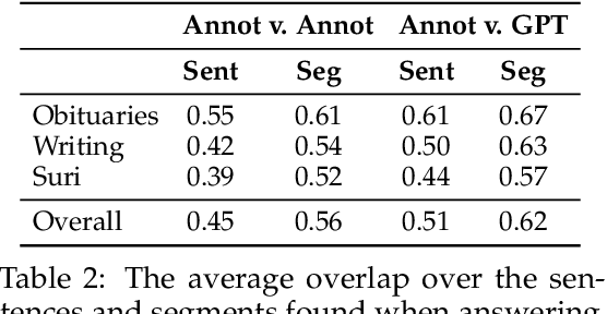 Abstract:The rise of large language models (LLMs) has brought a critical need for high-quality human-labeled data, particularly for processes like human feedback and evaluation. A common practice is to label data via consensus annotation over the judgments of multiple crowdworkers. However, different annotators may have different interpretations of labeling schemes unless given extensive training, and for subjective NLP tasks, even trained expert annotators can diverge heavily. We show that these nuances can be captured by high quality natural language explanations, and propose a method to rescale ordinal annotation in the presence of disagreement using LLMs. Specifically, we feed Likert ratings and corresponding natural language explanations into an LLM and prompt it to produce a numeric score. This score should reflect the underlying assessment of the example by the annotator. The presence of explanations allows the LLM to homogenize ratings across annotators in spite of scale usage differences. We explore our technique in the context of a document-grounded question answering task on which large language models achieve near-human performance. Among questions where annotators identify incompleteness in the answers, our rescaling improves correlation between nearly all annotator pairs, improving pairwise correlation on these examples by an average of 0.2 Kendall's tau.