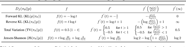 Abstract:Aligning language models with preferences can be posed as approximating a target distribution representing some desired behavior. Existing approaches differ both in the functional form of the target distribution and the algorithm used to approximate it. For instance, Reinforcement Learning from Human Feedback (RLHF) corresponds to minimizing a reverse KL from an implicit target distribution arising from a KL penalty in the objective. On the other hand, Generative Distributional Control (GDC) has an explicit target distribution and minimizes a forward KL from it using the Distributional Policy Gradient (DPG) algorithm. In this paper, we propose a new approach, f-DPG, which allows the use of any f-divergence to approximate any target distribution. f-DPG unifies both frameworks (RLHF, GDC) and the approximation methods (DPG, RL with KL penalties). We show the practical benefits of various choices of divergence objectives and demonstrate that there is no universally optimal objective but that different divergences are good for approximating different targets. For instance, we discover that for GDC, the Jensen-Shannon divergence frequently outperforms forward KL divergence by a wide margin, leading to significant improvements over prior work.