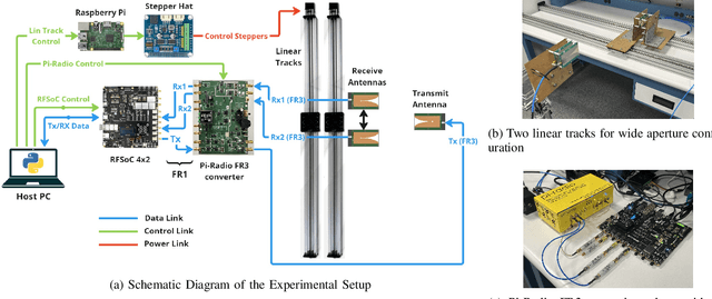 Abstract:The upper mid-band (or FR3, spanning 6-24 GHz) is a crucial frequency range for next-generation mobile networks, offering a favorable balance between coverage and spectrum efficiency. From another perspective, the systems operating in the near-field in both indoor environment and outdoor environments can support line-of-sight multiple input multiple output (MIMO) communications and be beneficial from the FR3 bands. In this paper, a novel method is proposed to measure the near-field parameters leveraging a recently developed reflection model where the near-field paths can be described by their image points. We show that these image points can be accurately estimated via triangulation from multiple measurements with a small number of antennas in each measurement, thus affording a low-cost procedure for near-field multi-path parameter extraction. A preliminary experimental apparatus is presented comprising 2 transmit and 2 receive antennas mounted on a linear track to measure the 2x2 MIMO channel at various displacements. The system uses a recently-developed wideband radio frequency (RF) transceiver board with fast frequency switching, an FPGA for fast baseband processing, and a new parameter extraction method to recover paths and spherical characteristics from the multiple 2x2 measurements.