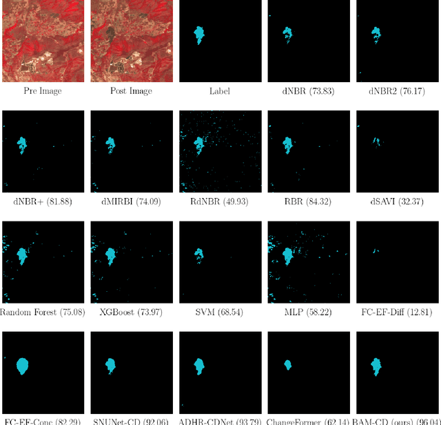 Abstract:Over the last decade there has been an increasing frequency and intensity of wildfires across the globe, posing significant threats to human and animal lives, ecosystems, and socio-economic stability. Therefore urgent action is required to mitigate their devastating impact and safeguard Earth's natural resources. Robust Machine Learning methods combined with the abundance of high-resolution satellite imagery can provide accurate and timely mappings of the affected area in order to assess the scale of the event, identify the impacted assets and prioritize and allocate resources effectively for the proper restoration of the damaged region. In this work, we create and introduce a machine-learning ready dataset we name FLOGA (Forest wiLdfire Observations for the Greek Area). This dataset is unique as it comprises of satellite imagery acquired before and after a wildfire event, it contains information from Sentinel-2 and MODIS modalities with variable spatial and spectral resolution, and contains a large number of events where the corresponding burnt area ground truth has been annotated by domain experts. FLOGA covers the wider region of Greece, which is characterized by a Mediterranean landscape and climatic conditions. We use FLOGA to provide a thorough comparison of multiple Machine Learning and Deep Learning algorithms for the automatic extraction of burnt areas, approached as a change detection task. We also compare the results to those obtained using standard specialized spectral indices for burnt area mapping. Finally, we propose a novel Deep Learning model, namely BAM-CD. Our benchmark results demonstrate the efficacy of the proposed technique in the automatic extraction of burnt areas, outperforming all other methods in terms of accuracy and robustness. Our dataset and code are publicly available at: https://github.com/Orion-AI-Lab/FLOGA.