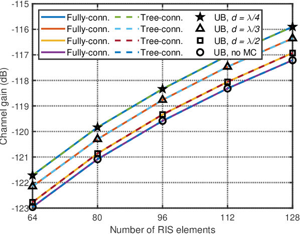 Abstract:Reconfigurable Intelligent Surface (RIS) is a breakthrough technology enabling the dynamic control of the propagation environment in wireless communications through programmable surfaces. To improve the flexibility of conventional diagonal RIS (D-RIS), beyond diagonal RIS (BD-RIS) has emerged as a family of more general RIS architectures. However, D-RIS and BD-RIS have been commonly explored neglecting mutual coupling effects, while the global optimization of RIS with mutual coupling, its performance limits, and scaling laws remain unexplored. This study addresses these gaps by deriving global optimal closed-form solutions for BD-RIS with mutual coupling to maximize the channel gain, specifically fully- and tree-connected RISs. Besides, we provide the expression of the maximum channel gain achievable in the presence of mutual coupling and its scaling law in closed form. By using the derived scaling laws, we analytically prove that mutual coupling increases the channel gain on average under Rayleigh fading channels. Our theoretical analysis, confirmed by numerical simulations, shows that both fully- and tree-connected RISs with mutual coupling achieve the same channel gain upper bound when optimized with the proposed global optimal solutions. Furthermore, we observe that a mutual coupling-unaware optimization of RIS can cause a channel gain degradation of up to 5 dB.