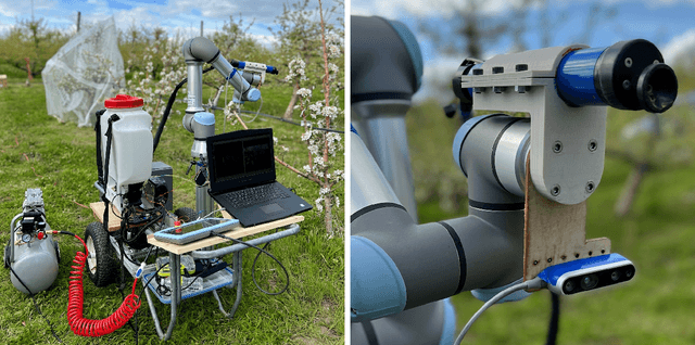 Abstract:This research presents a novel, robotic pollination system designed for targeted pollination of apple flowers in modern fruiting wall orchards. Developed in response to the challenges of global colony collapse disorder, climate change, and the need for sustainable alternatives to traditional pollinators, the system utilizes a commercial manipulator, a vision system, and a spray nozzle for pollen application. Initial tests in April 2022 pollinated 56% of the target flower clusters with at least one fruit with a cycle time of 6.5 s. Significant improvements were made in 2023, with the system accurately detecting 91% of available flowers and pollinating 84% of target flowers with a reduced cycle time of 4.8 s. This system showed potential for precision artificial pollination that can also minimize the need for labor-intensive field operations such as flower and fruitlet thinning.