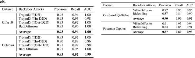 Abstract:Diffusion Models are vulnerable to backdoor attacks, where malicious attackers inject backdoors by poisoning some parts of the training samples during the training stage. This poses a serious threat to the downstream users, who query the diffusion models through the API or directly download them from the internet. To mitigate the threat of backdoor attacks, there have been a plethora of investigations on backdoor detections. However, none of them designed a specialized backdoor detection method for diffusion models, rendering the area much under-explored. Moreover, these prior methods mainly focus on the traditional neural networks in the classification task, which cannot be adapted to the backdoor detections on the generative task easily. Additionally, most of the prior methods require white-box access to model weights and architectures, or the probability logits as additional information, which are not always practical. In this paper, we propose a Unified Framework for Input-level backdoor Detection (UFID) on the diffusion models, which is motivated by observations in the diffusion models and further validated with a theoretical causality analysis. Extensive experiments across different datasets on both conditional and unconditional diffusion models show that our method achieves a superb performance on detection effectiveness and run-time efficiency. The code is available at https://github.com/GuanZihan/official_UFID.