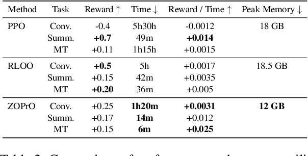 Abstract:Fine-tuning LLMs with first-order methods like back-propagation is computationally intensive. Zeroth-Order (ZO) optimisation, using function evaluations instead of gradients, reduces memory usage but suffers from slow convergence in high-dimensional models. As a result, ZO research in LLMs has mostly focused on classification, overlooking more complex generative tasks. In this paper, we introduce ZOPrO, a novel ZO algorithm designed for \textit{Preference Optimisation} in LLMs. We begin by analysing the interplay between policy and reward models during traditional (first-order) Preference Optimisation, uncovering patterns in their relative updates. Guided by these insights, we adapt Simultaneous Perturbation Stochastic Approximation (SPSA) with a targeted sampling strategy to accelerate convergence. Through experiments on summarisation, machine translation, and conversational assistants, we demonstrate that our method consistently enhances reward signals while achieving convergence times comparable to first-order methods. While it falls short of some state-of-the-art methods, our work is the first to apply Zeroth-Order methods to Preference Optimisation in LLMs, going beyond classification tasks and paving the way for a largely unexplored research direction. Code and visualisations are available at https://github.com/alessioGalatolo/VisZOPrO