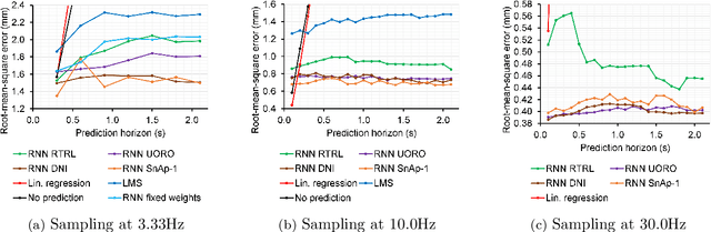 Abstract:During lung cancer radiotherapy, the position of infrared reflective objects on the chest can be recorded to estimate the tumor location. However, radiotherapy systems usually have a latency inherent to robot control limitations that impedes the radiation delivery precision. Not taking this phenomenon into account may cause unwanted damage to healthy tissues and lead to side effects such as radiation pneumonitis. In this research, we use nine observation records of the three-dimensional position of three external markers on the chest and abdomen of healthy individuals breathing during intervals from 73s to 222s. The sampling frequency is equal to 10Hz and the amplitudes of the recorded trajectories range from 6mm to 40mm in the superior-inferior direction. We forecast the location of each marker simultaneously with a horizon value (the time interval in advance for which the prediction is made) between 0.1s and 2.0s, using a recurrent neural network (RNN) trained with unbiased online recurrent optimization (UORO). We compare its performance with an RNN trained with real-time recurrent learning, least mean squares (LMS), and offline linear regression. Training and cross-validation are performed during the first minute of each sequence. On average, UORO achieves the lowest root-mean-square (RMS) and maximum error, equal respectively to 1.3mm and 8.8mm, with a prediction time per time step lower than 2.8ms (Dell Intel core i9-9900K 3.60Ghz). Linear regression has the lowest RMS error for the horizon values 0.1s and 0.2s, followed by LMS for horizon values between 0.3s and 0.5s, and UORO for horizon values greater than 0.6s.