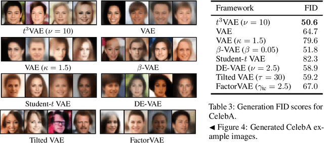 Abstract:The variational autoencoder (VAE) typically employs a standard normal prior as a regularizer for the probabilistic latent encoder. However, the Gaussian tail often decays too quickly to effectively accommodate the encoded points, failing to preserve crucial structures hidden in the data. In this paper, we explore the use of heavy-tailed models to combat over-regularization. Drawing upon insights from information geometry, we propose $t^3$VAE, a modified VAE framework that incorporates Student's t-distributions for the prior, encoder, and decoder. This results in a joint model distribution of a power form which we argue can better fit real-world datasets. We derive a new objective by reformulating the evidence lower bound as joint optimization of KL divergence between two statistical manifolds and replacing with $\gamma$-power divergence, a natural alternative for power families. $t^3$VAE demonstrates superior generation of low-density regions when trained on heavy-tailed synthetic data. Furthermore, we show that $t^3$VAE significantly outperforms other models on CelebA and imbalanced CIFAR-100 datasets.