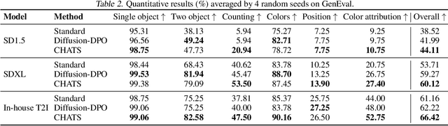 Abstract:Diffusion models have emerged as a dominant approach for text-to-image generation. Key components such as the human preference alignment and classifier-free guidance play a crucial role in ensuring generation quality. However, their independent application in current text-to-image models continues to face significant challenges in achieving strong text-image alignment, high generation quality, and consistency with human aesthetic standards. In this work, we for the first time, explore facilitating the collaboration of human performance alignment and test-time sampling to unlock the potential of text-to-image models. Consequently, we introduce CHATS (Combining Human-Aligned optimization and Test-time Sampling), a novel generative framework that separately models the preferred and dispreferred distributions and employs a proxy-prompt-based sampling strategy to utilize the useful information contained in both distributions. We observe that CHATS exhibits exceptional data efficiency, achieving strong performance with only a small, high-quality funetuning dataset. Extensive experiments demonstrate that CHATS surpasses traditional preference alignment methods, setting new state-of-the-art across various standard benchmarks.