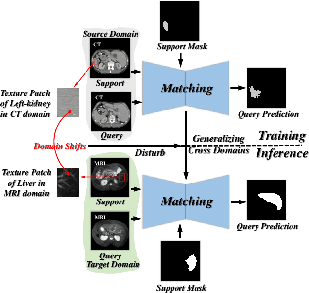Abstract:Few-shot medical image segmentation (FSMIS) aims to perform the limited annotated data learning in the medical image analysis scope. Despite the progress has been achieved, current FSMIS models are all trained and deployed on the same data domain, as is not consistent with the clinical reality that medical imaging data is always across different data domains (e.g. imaging modalities, institutions and equipment sequences). How to enhance the FSMIS models to generalize well across the different specific medical imaging domains? In this paper, we focus on the matching mechanism of the few-shot semantic segmentation models and introduce an Earth Mover's Distance (EMD) calculation based domain robust matching mechanism for the cross-domain scenario. Specifically, we formulate the EMD transportation process between the foreground support-query features, the texture structure aware weights generation method, which proposes to perform the sobel based image gradient calculation over the nodes, is introduced in the EMD matching flow to restrain the domain relevant nodes. Besides, the point set level distance measurement metric is introduced to calculated the cost for the transportation from support set nodes to query set nodes. To evaluate the performance of our model, we conduct experiments on three scenarios (i.e., cross-modal, cross-sequence and cross-institution), which includes eight medical datasets and involves three body regions, and the results demonstrate that our model achieves the SoTA performance against the compared models.
