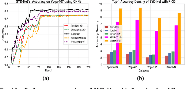 Abstract:Human body-pose estimation is a complex problem in computer vision. Recent research interests have been widened specifically on the Sports, Yoga, and Dance (SYD) postures for maintaining health conditions. The SYD pose categories are regarded as a fine-grained image classification task due to the complex movement of body parts. Deep Convolutional Neural Networks (CNNs) have attained significantly improved performance in solving various human body-pose estimation problems. Though decent progress has been achieved in yoga postures recognition using deep learning techniques, fine-grained sports, and dance recognition necessitates ample research attention. However, no benchmark public image dataset with sufficient inter-class and intra-class variations is available yet to address sports and dance postures classification. To solve this limitation, we have proposed two image datasets, one for 102 sport categories and another for 12 dance styles. Two public datasets, Yoga-82 which contains 82 classes and Yoga-107 represents 107 classes are collected for yoga postures. These four SYD datasets are experimented with the proposed deep model, SYD-Net, which integrates a patch-based attention (PbA) mechanism on top of standard backbone CNNs. The PbA module leverages the self-attention mechanism that learns contextual information from a set of uniform and multi-scale patches and emphasizes discriminative features to understand the semantic correlation among patches. Moreover, random erasing data augmentation is applied to improve performance. The proposed SYD-Net has achieved state-of-the-art accuracy on Yoga-82 using five base CNNs. SYD-Net's accuracy on other datasets is remarkable, implying its efficiency. Our Sports-102 and Dance-12 datasets are publicly available at https://sites.google.com/view/syd-net/home.
