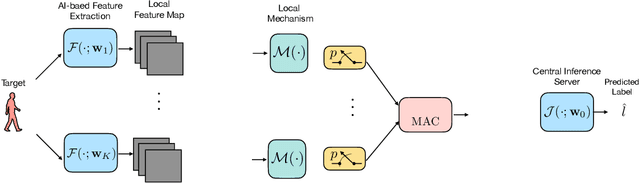 Abstract:Collaborative inference among multiple wireless edge devices has the potential to significantly enhance Artificial Intelligence (AI) applications, particularly for sensing and computer vision. This approach typically involves a three-stage process: a) data acquisition through sensing, b) feature extraction, and c) feature encoding for transmission. However, transmitting the extracted features poses a significant privacy risk, as sensitive personal data can be exposed during the process. To address this challenge, we propose a novel privacy-preserving collaborative inference mechanism, wherein each edge device in the network secures the privacy of extracted features before transmitting them to a central server for inference. Our approach is designed to achieve two primary objectives: 1) reducing communication overhead and 2) ensuring strict privacy guarantees during feature transmission, while maintaining effective inference performance. Additionally, we introduce an over-the-air pooling scheme specifically designed for classification tasks, which provides formal guarantees on the privacy of transmitted features and establishes a lower bound on classification accuracy.