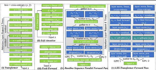 Abstract:Transformer models trained on long sequences often achieve higher accuracy than short sequences. Unfortunately, conventional transformers struggle with long sequence training due to the overwhelming computation and memory requirements. Existing methods for long sequence training offer limited speedup and memory reduction, and may compromise accuracy. This paper presents a novel and efficient distributed training method, the Long Short-Sequence Transformer (LSS Transformer), for training transformer with long sequences. It distributes a long sequence into segments among GPUs, with each GPU computing a partial self-attention for its segment. Then, it uses a fused communication and a novel double gradient averaging technique to avoid the need to aggregate partial self-attention and minimize communication overhead. We evaluated the performance between LSS Transformer and the state-of-the-art Nvidia sequence parallelism on a Wikipedia enwik8 dataset. Results show that our proposed method lead to 5.6x faster and 10.2x more memory-efficient implementation compared to state-of-the-art sequence parallelism on 144 Nvidia V100 GPUs. Moreover, our algorithm scales to an extreme sequence length of 50,112 at 3,456 GPUs, achieving 161% super-linear parallel efficiency and a throughput of 32 petaflops.