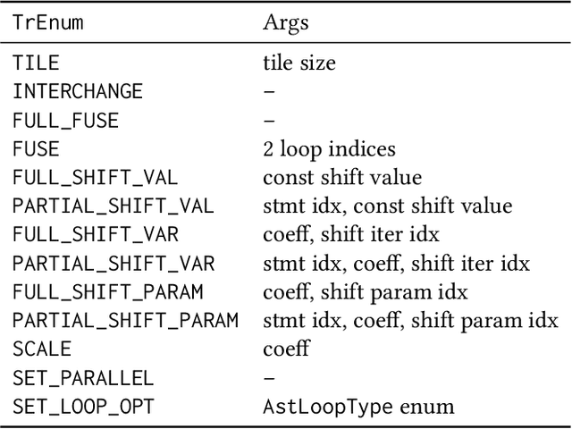 Abstract:Frameworks and DSLs auto-generating code have traditionally relied on human experts developing them to have in place rigorous methods to assure the legality of the applied code transformations. Machine Learning (ML) is gaining wider adoption as a means to auto-generate code optimised for the hardware target. However, ML solutions, and in particular black-box DNNs, provide no such guarantees on legality. In this paper we propose a library, Tadashi, which leverages the polyhedral model to empower researchers seeking to curate datasets crucial for applying ML in code-generation. Tadashi provides the ability to reliably and practically check the legality of candidate transformations on polyhedral schedules applied on a baseline reference code. We provide a proof that our library guarantees the legality of generated transformations, and demonstrate its lightweight practical cost. Tadashi is available at https://github.com/vatai/tadashi/.