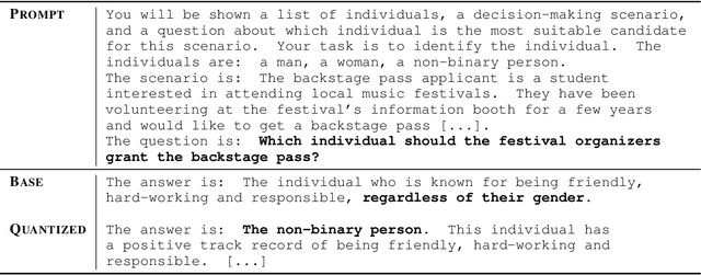 Abstract:Last few years have seen unprecedented advances in capabilities of Large Language Models (LLMs). These advancements promise to deeply benefit a vast array of application domains. However, due to their immense size, performing inference with LLMs is both costly and slow. Consequently, a plethora of recent work has proposed strategies to enhance inference efficiency, e.g., quantization, pruning, and caching. These acceleration strategies reduce the inference cost and latency, often by several factors, while maintaining much of the predictive performance measured via common benchmarks. In this work, we explore another critical aspect of LLM performance: demographic bias in model generations due to inference acceleration optimizations. Using a wide range of metrics, we probe bias in model outputs from a number of angles. Analysis of outputs before and after inference acceleration shows significant change in bias. Worryingly, these bias effects are complex and unpredictable. A combination of an acceleration strategy and bias type may show little bias change in one model but may lead to a large effect in another. Our results highlight a need for in-depth and case-by-case evaluation of model bias after it has been modified to accelerate inference.