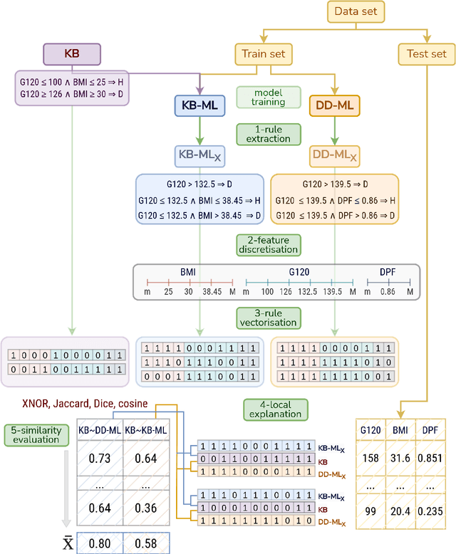 Abstract:In clinical practice, decision-making relies heavily on established protocols, often formalised as rules. Concurrently, Machine Learning (ML) models, trained on clinical data, aspire to integrate into medical decision-making processes. However, despite the growing number of ML applications, their adoption into clinical practice remains limited. Two critical concerns arise, relevant to the notions of consistency and continuity of care: (a) accuracy - the ML model, albeit more accurate, might introduce errors that would not have occurred by applying the protocol; (b) interpretability - ML models operating as black boxes might make predictions based on relationships that contradict established clinical knowledge. In this context, the literature suggests using ML models integrating domain knowledge for improved accuracy and interpretability. However, there is a lack of appropriate metrics for comparing ML models with clinical rules in addressing these challenges. Accordingly, in this article, we first propose metrics to assess the accuracy of ML models with respect to the established protocol. Secondly, we propose an approach to measure the distance of explanations provided by two rule sets, with the goal of comparing the explanation similarity between clinical rule-based systems and rules extracted from ML models. The approach is validated on the Pima Indians Diabetes dataset by training two neural networks - one exclusively on data, and the other integrating a clinical protocol. Our findings demonstrate that the integrated ML model achieves comparable performance to that of a fully data-driven model while exhibiting superior accuracy relative to the clinical protocol, ensuring enhanced continuity of care. Furthermore, we show that our integrated model provides explanations for predictions that align more closely with the clinical protocol compared to the data-driven model.