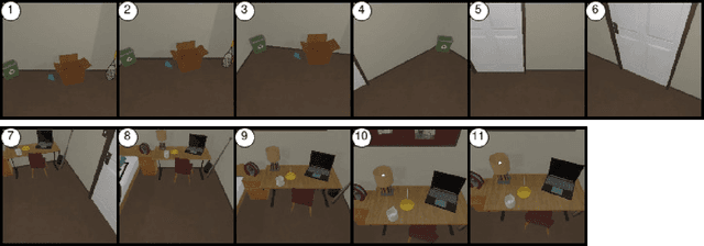Abstract:As robots become more generalized and deployed in diverse environments, they must interact with complex objects, many with multiple independent joints or degrees of freedom (DoF) requiring precise control. A common strategy is object modeling, where compact state-space models are learned from real-world observations and paired with classical planning. However, existing methods often rely on prior knowledge or focus on single-DoF objects, limiting their applicability. They also fail to handle occluded joints and ignore the manipulation sequences needed to access them. We address this by learning object models from human demonstrations. We introduce Object Kinematic Sequence Machines (OKSMs), a novel representation capturing both kinematic constraints and manipulation order for multi-DoF objects. To estimate these models from point cloud data, we present Pokenet, a deep neural network trained on human demonstrations. We validate our approach on 8,000 simulated and 1,600 real-world annotated samples. Pokenet improves joint axis and state estimation by over 20 percent on real-world data compared to prior methods. Finally, we demonstrate OKSMs on a Sawyer robot using inverse kinematics-based planning to manipulate multi-DoF objects.